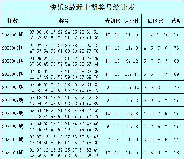 福彩快乐8第2026011期开奖回顾:01 03 12 16 22 25 27 30 32 49 52 56 59 61 62 63 66 68 69 79,其中奖号奇偶比开出10:10,大小比开出11:9,包含4个小奇号码:01 03 25 27,5个小偶号码:12 16 22 30 32,6个大奇号码:49 59 61 63 69 79,5个大偶号码:52 56 62 66 68。