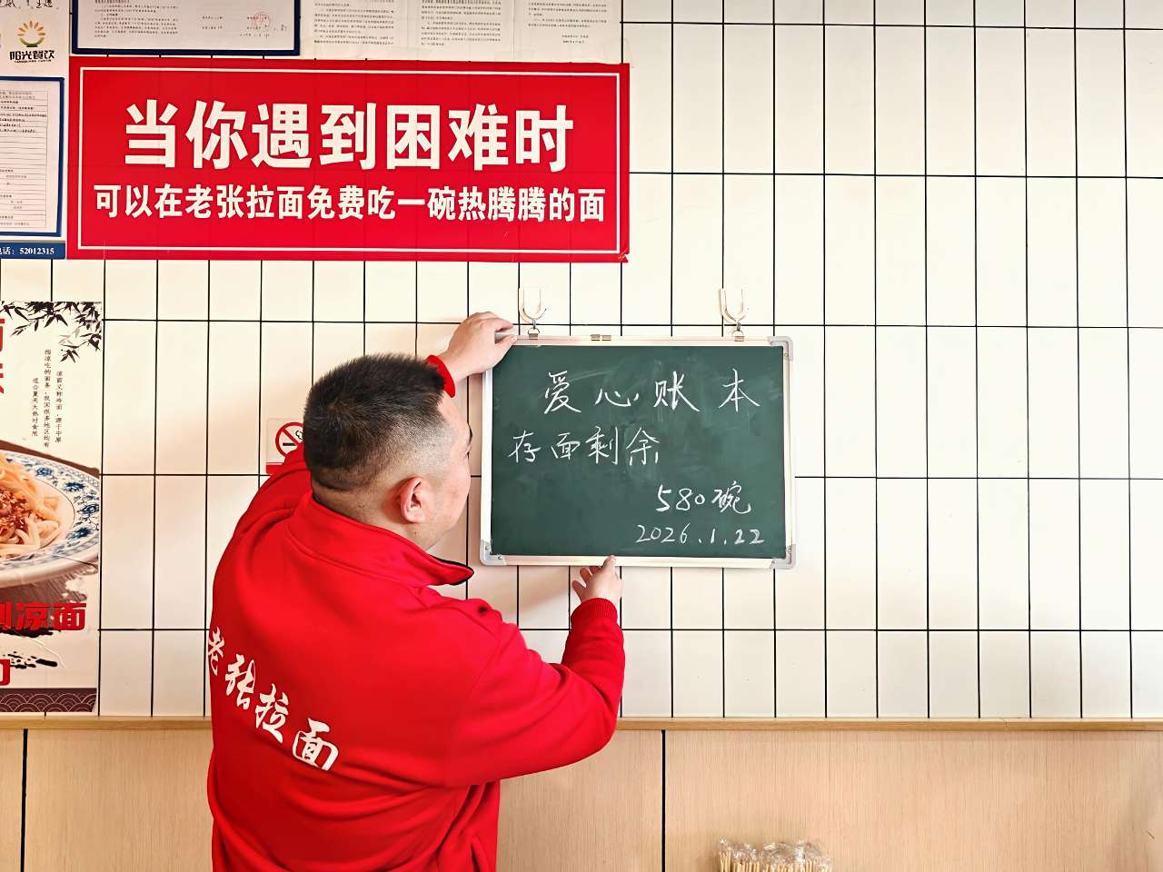 成奶仓是甘肃人,17年前初到北京时,曾因困窘受到一家小饭馆老板的帮助——一碗面,让他记了很久。2018年开店后,他便在店里贴出了那张字条。柜台边磨旧的笔记本和挂在墙上的小黑板,记录着邻里之间的“存面”善款,数字每日更新,庄闲和app成为社区爱心接力的痕迹。七年来,他坚持为困难人群提供免费面、为外卖骑手加量不加价、为就医家庭送面、为晚归人留灯热汤……他说:“守护他人尊严,是商户应尽的责任。”