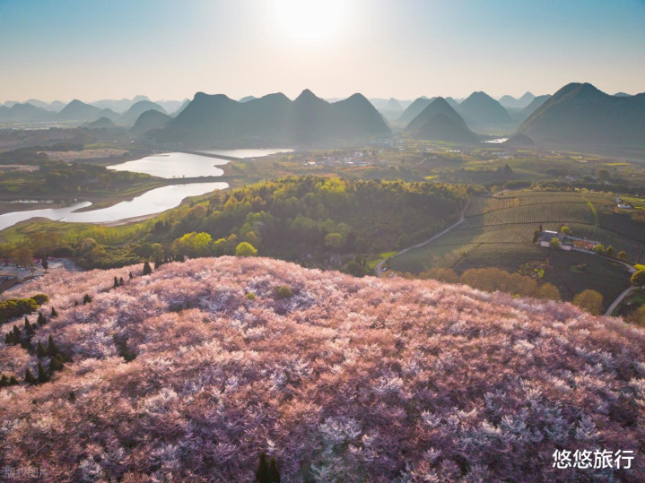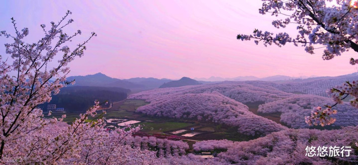 平坝樱花每年的花期基本都在3月中旬-4月初盛开,从高空俯瞰,黛色的山,湛蓝的湖水,樱花如云似雾。
