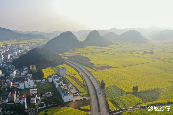 2月下旬-3月中旬,80万亩油菜花海开到天际,一场流动的视觉盛宴。金鸡峰丛,可以登上观景台俯瞰,连绵起伏的峰林交相辉映,也可以走入花田。