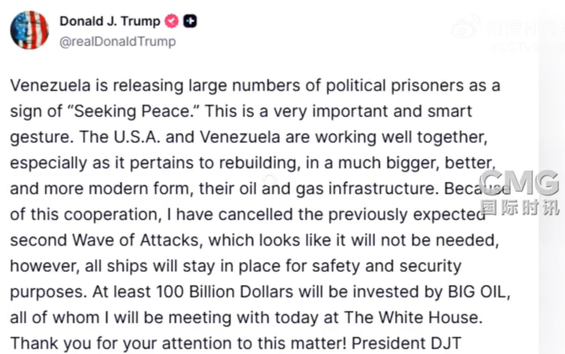 据新华社,美国总统特朗普1月9日称,已取消此前预计的对委内瑞拉第二波军事打击。