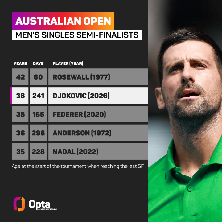 据统计,38岁241天的德约科维奇超过费德勒,成为公开赛年代打进澳网男单四强第二年长球员,仅次于42岁60天的肯-罗斯威尔。